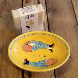Porte savon en céramique, décoré à la main. Motif poissons.