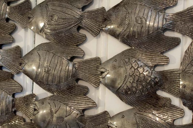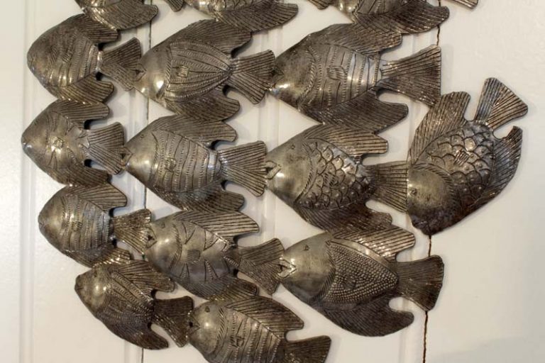 • The fish are hand-chiseled from a single piece of recycled sheet metal (bosmetal).