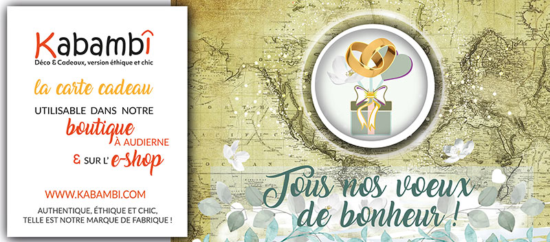 La carte cadeau Kabambî est le cadeau idéal pour faire plaisir pour un mariage. Avec elle, vos destinataires auront accès à l’intégralité de notre catalogue !