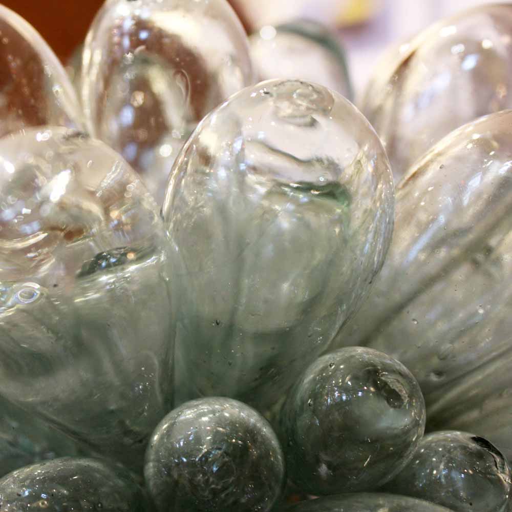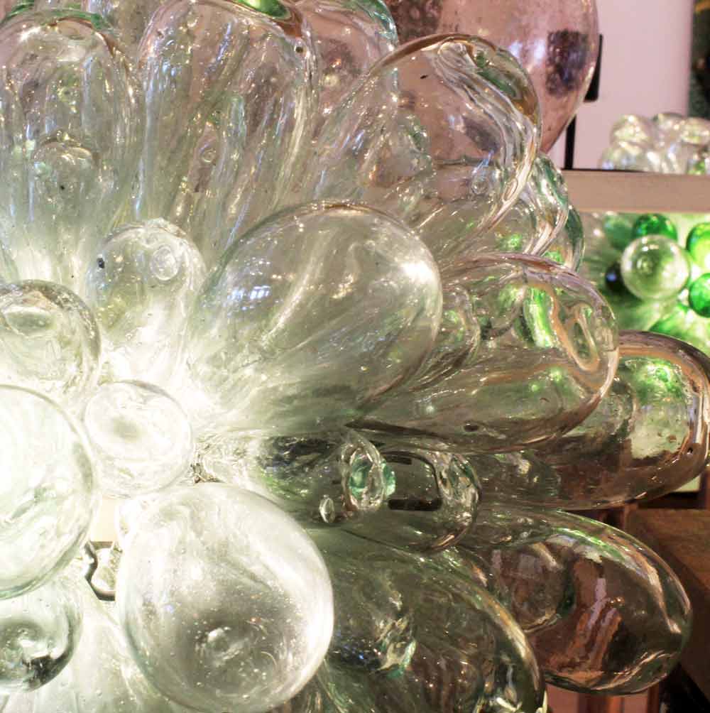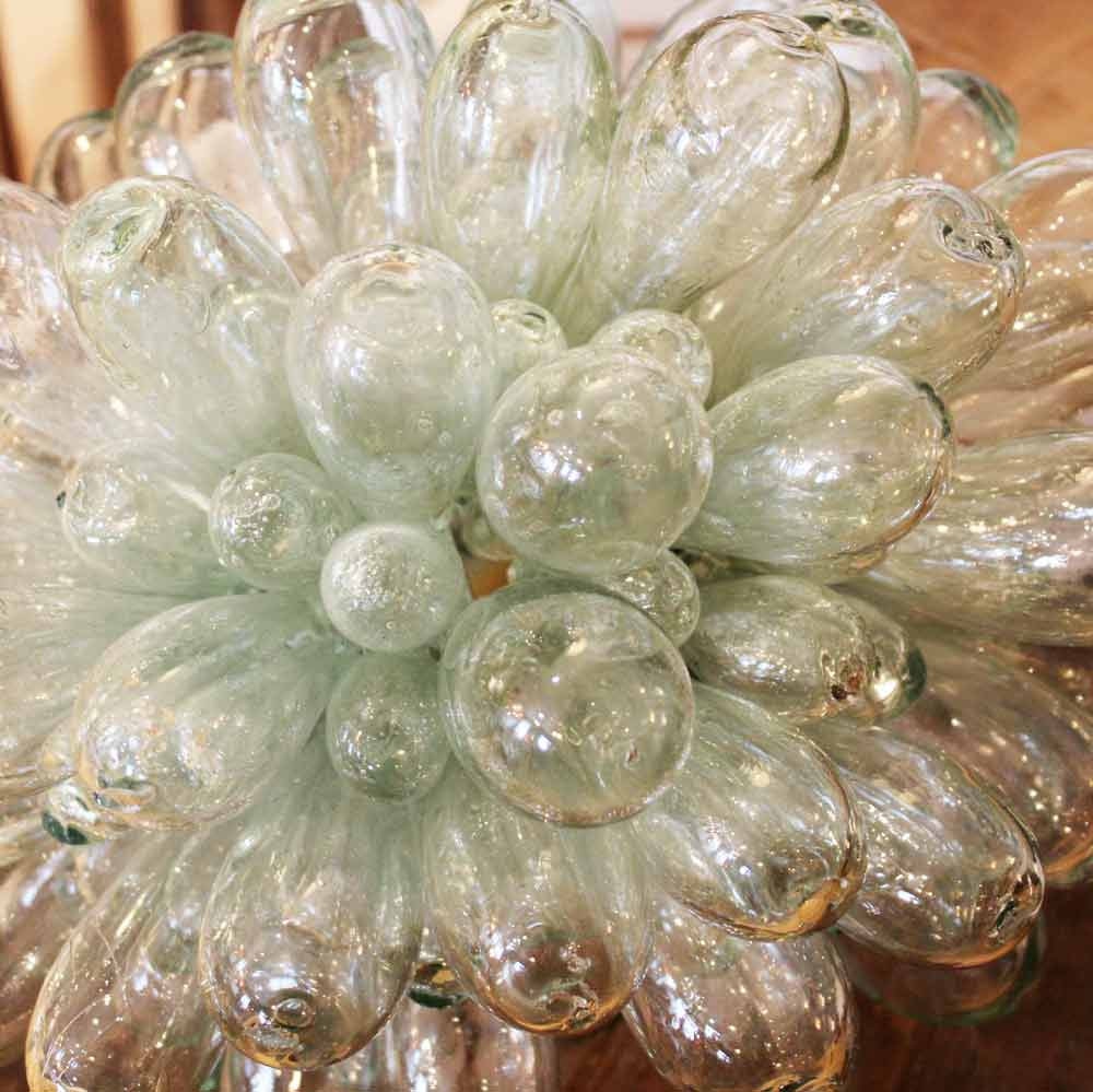 Chaque goutte est soufflée individuellement, la forme va donc légèrement varier d’une goutte à l’autre, ce qui est du plus bel effet quand elles sont rassemblées ainsi en grappe. Certaines gouttes peuvent présenter de petites inclusions, dues à la méthode artisanale de soufflage.