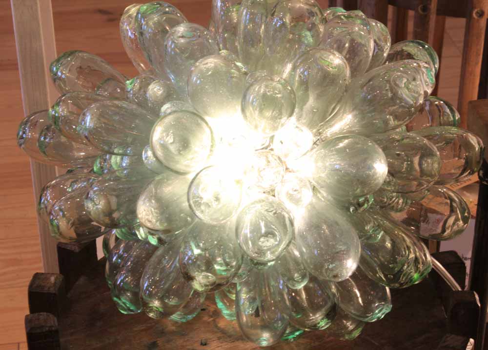 Lampe avec des gouttes en verre soufflé recyclé transparentes.