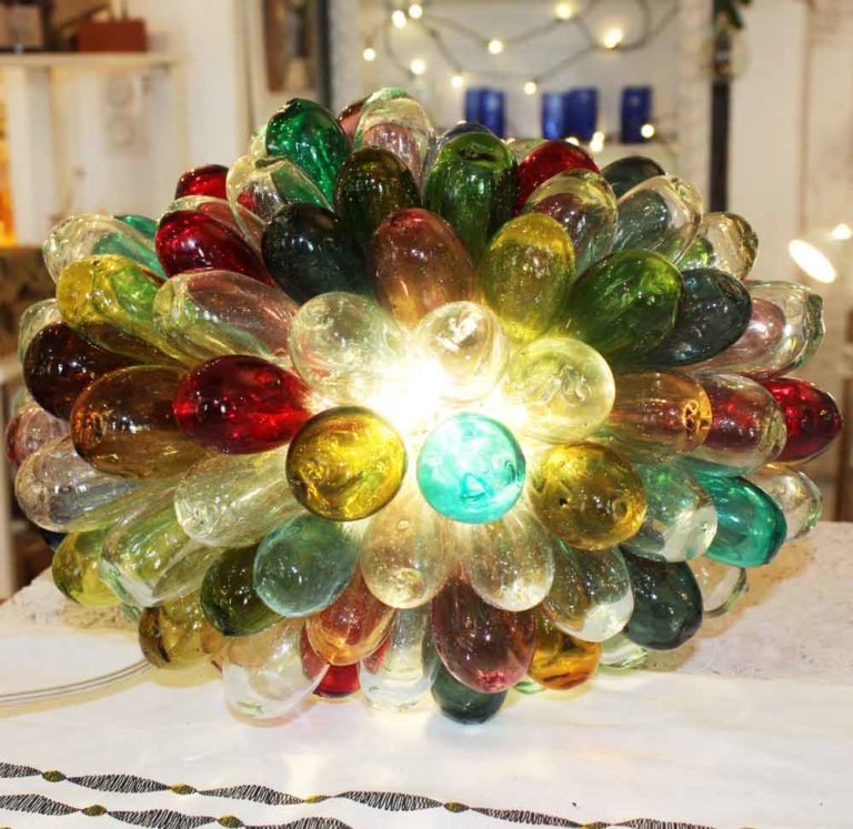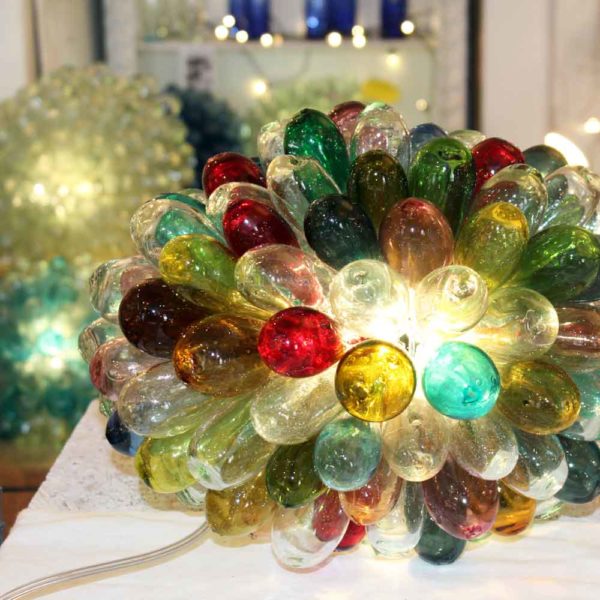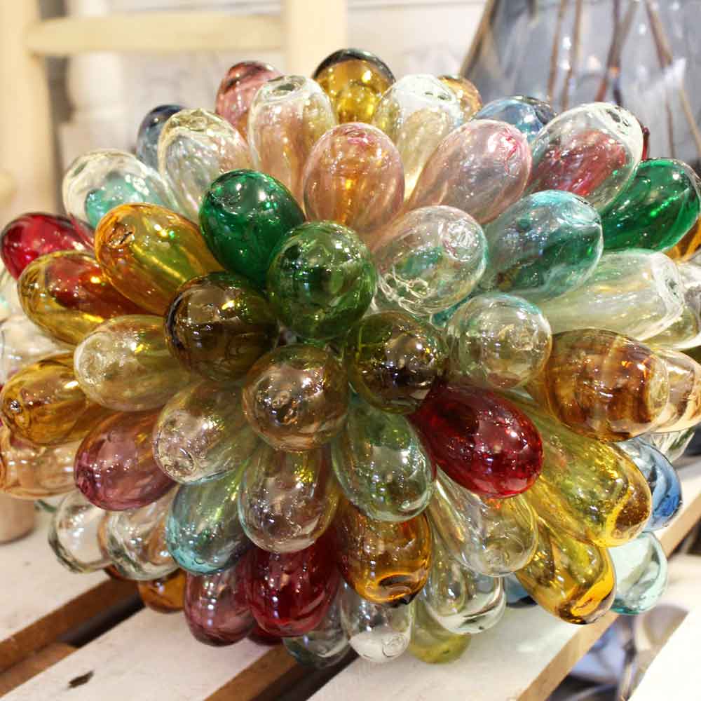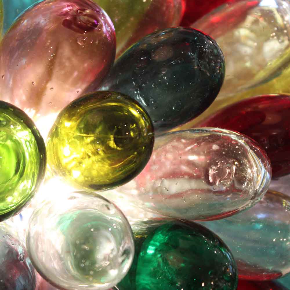 Chaque goutte est soufflée individuellement, la forme va donc légèrement varier d’une goutte à l’autre, ce qui est du plus bel effet quand elles sont rassemblées ainsi en grappe.