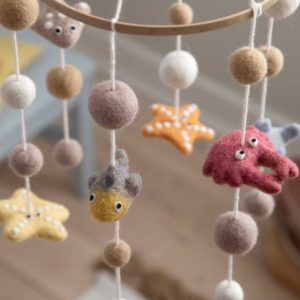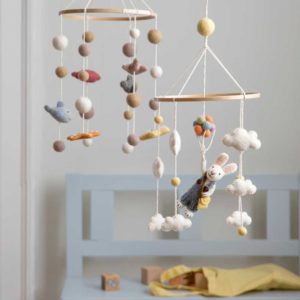 • Les liens sont en coton et l’anneau de support est en bois. Une boucle pour pouvoir suspendre le mobile.