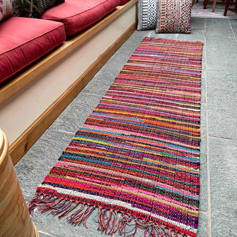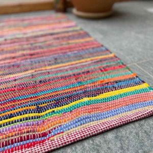 • Ce tapis de couloir multicolore est un parfait exemple d’ « upcycling » : Il est fabriqué à partir de chutes de coton lavés et découpés pour leur donner une autre utilité dans une seconde vie ! (Upcycling: valoriser les produits usagés en leur donnant une nouvelle vie plus qualitative).